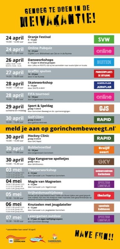 Meer informatie? https://www.gorinchembeweegt.nl/nieuws/veel-leuke-activiteiten-in-de-meivakantie/