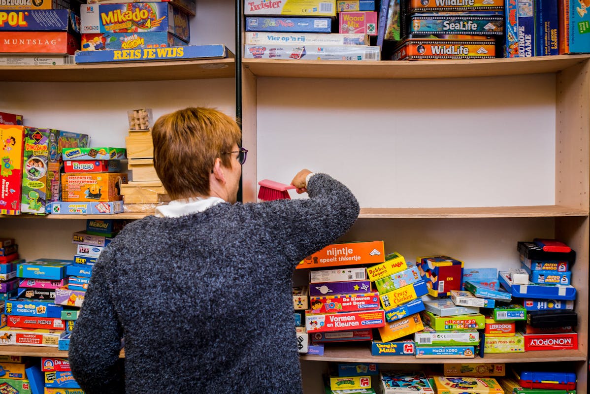 ‘’Ik heb voornamelijk als taak om het speelgoed te sorteren en er weer mooie, complete sets van te maken,’’ vertelt een vrijwilliger. ‘’Bijvoorbeeld voor lego en playmobil. Ik vind dat een arm kind geen armoedig kind is. Wat zij meekrijgen moet net zo volwaardig en compleet zijn.’’