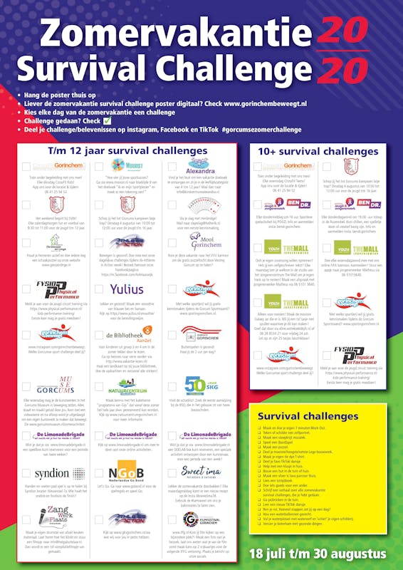 De jeugd wordt deze zomervakantie uitgedaagd om heel veel challenges te gaan doen. 25 organisaties hebben leuke, creatieve, culturele, gezonde en/of sportieve challenges bedacht. Het resultaat is een Zomervakantie Survival Challenge poster vol uitdagingen voor de jeugd van Gorinchem.